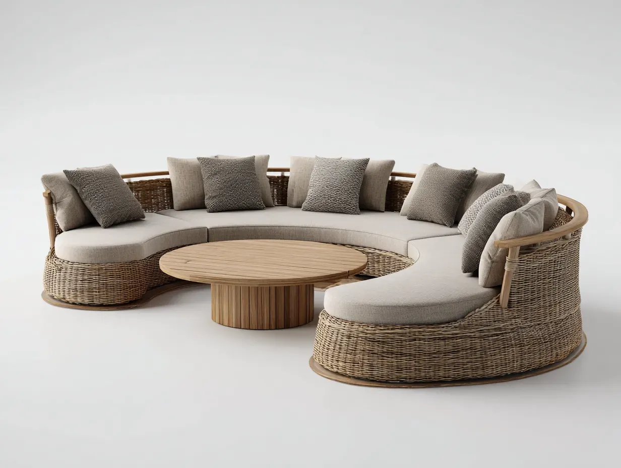 La conception courbe facilite l'organisation de l'espace et favorise une disposition conviviale autour de la table centrale. La table ronde apporte une surface stable et accessible pour un usage extérieur quotidien.