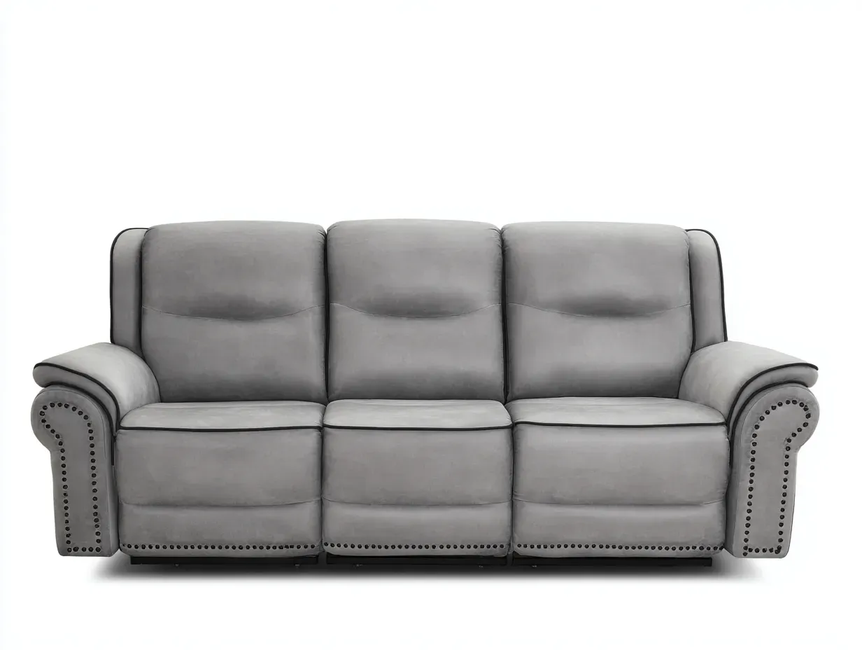 Le canapé intègre un mécanisme de relaxation manuel permettant d'incliner le dossier et de relever le repose-jambes afin d'améliorer le confort lors des phases de détente. Les accoudoirs généreusement rembourrés contribuent au soutien latéral.