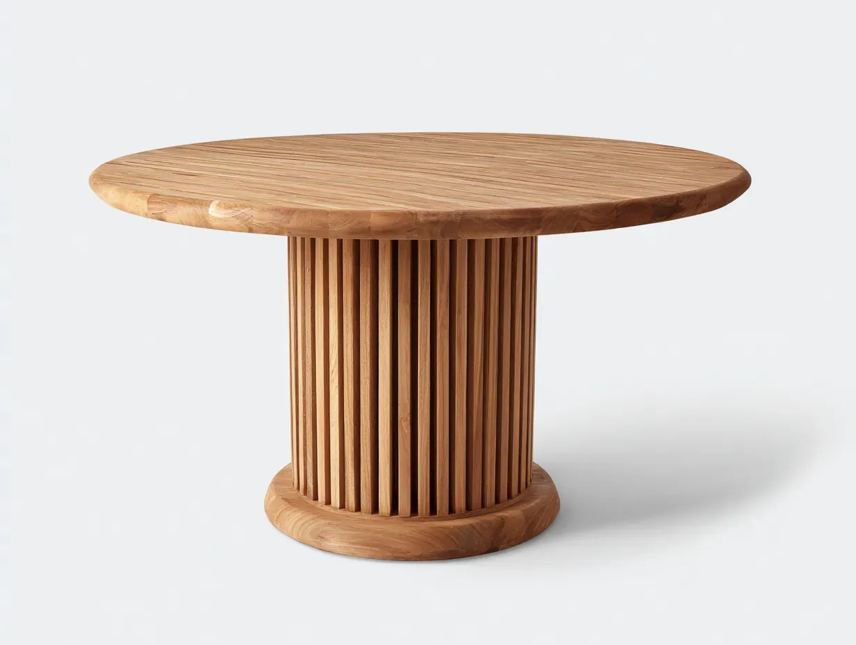 La structure est réalisée en bois avec une finition naturelle. Le plateau à lames apparentes et le piètement central assurent une bonne stabilité tout en conservant une esthétique équilibrée et adaptée à un usage extérieur.