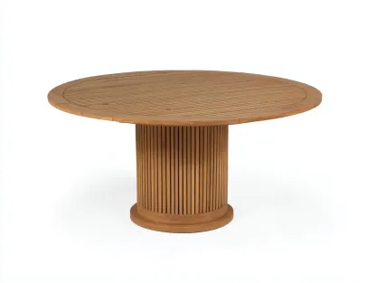 La table est fabriquée en bois de couleur naturelle. Le plateau à lattes assure une surface stable et régulière, tandis que le piètement central cylindrique garantit un bon maintien et une esthétique équilibrée.