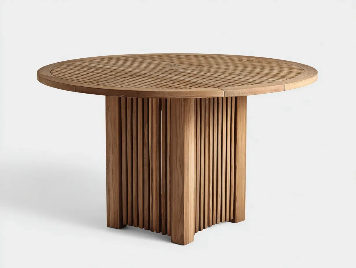 La structure est réalisée en bois avec une finition naturelle. Le plateau à lames fines met en valeur le veinage du bois, tandis que le piètement central vertical assure une stabilité fiable et une présence visuelle équilibrée adaptée à un usage extérieur.