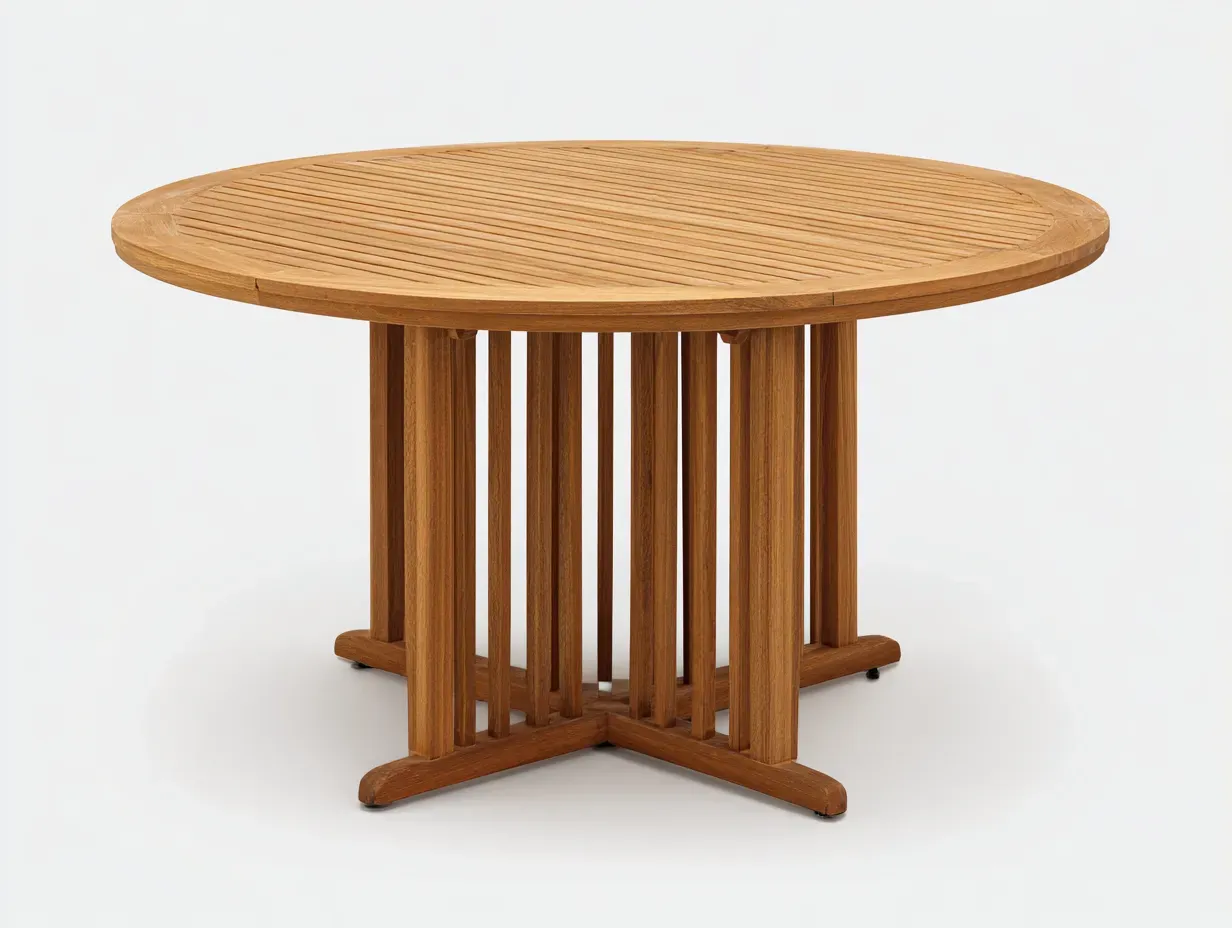 La structure est réalisée en bois avec une finition naturelle. Le plateau à lames régulières met en valeur le veinage du bois, tandis que le piètement central structuré assure une stabilité fiable et une esthétique équilibrée pour un usage extérieur.